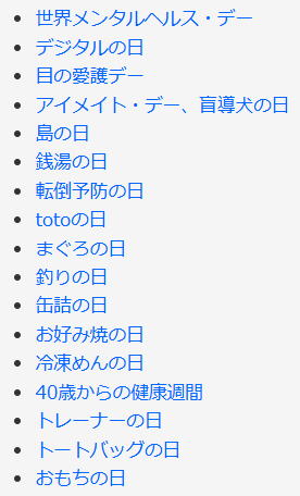 今日は何の日 (出典 雑学ネタ帳)![]() ![]() ![]() ![]() ![]() 世界メンタルヘルス・デー(10月10日 記念日) オランダに本部を置く非政府組織(NGO)の世界精神保健連盟(World Federation for Mental Health:WFMH)が1992年(平成4年)に制定。 その後、国連の専門機関である世界保健機構(World Health Organization:WHO)が協賛し、国際デーの一つとして認められた。「世界精神保健デー」ともされる。英語表記は「World Mental Health Day」。 ![]() World Mental Health Day メンタルヘルスの問題に関する世間の意識や関心を高め、偏見を無くし、正しい知識を普及させることが目的。また、この日はメンタルヘルスの問題に取り組んでいる全ての関係者が自分の仕事について、そして世界中の人々にとってメンタルヘルスケアを現実にするために更に何をする必要があるかについて話す機会となる。 毎年テーマを掲げ、この日を中心に世界各地でメンタルヘルスに関連する啓発イベントなどが実施される。日本ではメンタルヘルスに関連するアウェアネスリボン運動の「シルバーリボン」が、2011年(平成23年)からこの日に合わせたイベントを展開している。 |