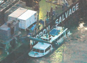 ![]() 海面までつり上げられた観光船「KAZUT(カズワン)」 =2022年5月26日午後7時2分、北海道斜里町沖、朝日新聞社機から、迫和義撮影 |