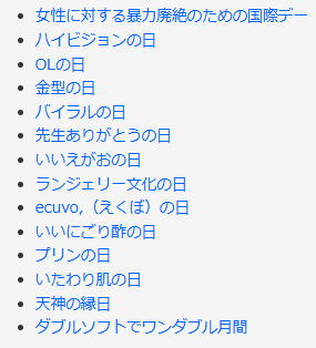 今日は何の日 (出典 雑学ネタ帳)![]() 女性に対する暴力廃絶のための国際デー(11月25日 記念日) 1999年(平成11年)12月17日の国連総会で制定。国際デーの一つ。「女性に対する暴力撤廃の国際デー」ともされる。 英語表記は「International Day for the Elimination of Violence against Women」。 1960年(昭和35年)のこの日、ドミニカ共和国の政治活動家であったミラバル3姉妹が、ドミニカの支配者ラファエル・トルヒーヨの命令で手下により惨殺された。 ミラバル3姉妹は「六月十四日運動」として知られる反トルヒーヨ政権グループを形成するなど、トルヒーヨの独裁政権に対する反対運動に身を投じていた。ミラバル3姉妹の死は大衆の大きな怒りを招き、6ヵ月後のトルヒーヨ暗殺の一つのきっかけになったと考えられている。 ![]() 女性に対する暴力廃絶のための国際デー 国連では、この日から12月10日の「世界人権デー」までを「性差別による暴力廃絶活動の16日間」と定め、オレンジ色をその象徴として周知・啓発を行っている。 日本では、2001年(平成13年)から総理府(現:内閣府)が、「女性に対する暴力をなくす運動」として11月12日からこの日を最終日とする2週間実施している。女性に対する暴力根絶のシンボルであるパープルリボンにちなんで、初日の11月12日に東京タワーや東京スカイツリーなどを紫色にライトアップする「パープル・ライトアップ」を実施している。 ![]() パープル・ライトアップ パープル・ライトアップには、女性に対するあらゆる暴力の根絶を広く呼びかけるとともに、被害者に対して、「ひとりで悩まず、まずは相談をしてください。」というメッセージが込められている。 |