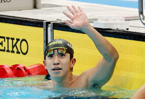 ![]() デフリンピック東京大会 水泳男子200メートル個人メドレーで優勝し観客席に手を振る茨隆太郎 =吉田耕一郎撮影 |