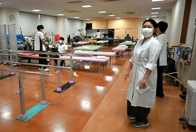 ![]() いずみ記念病院のリハビリテーション室。 小泉章子理事長(右)によると、作業療法士や理学療法士の確保も難しくなっているという=東京都足立区 |