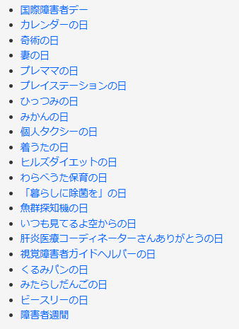 今日は何の日 (出典 雑学ネタ帳)![]() 国際障害者デー(12月3日 記念日) 1992年(平成4年)11月の第47回国連総会で制定。国際デーの一つ。英語表記は「International Day of Persons with Disabilities」。 1982年(昭和57年)のこの日、「障害者に関する世界行動計画」が第37回国連総会で採択された。障害者問題への理解促進、障害者が人間らしい生活を送る権利とその補助の確保が目的。 ![]() 国際障害者デー 日本では12月9日を「障害者の日」としていた。12月9日は、1975年(昭和50年)に「障害者の権利宣言」が国連総会で採択された日である。その後、2004年(平成16年)に「国際障害者デー」の12月3日から「障害者の日」の12月9日までの一週間を「障害者週間」に制定した。 「障害者週間」は、12月9日の「障害者の日」に代わるものであり、国民の間に広く障害者の福祉についての関心と理解を深めるとともに、障害者が社会、経済、文化その他あらゆる分野の活動に積極的に参加する意欲を高めることを目的としている。 |