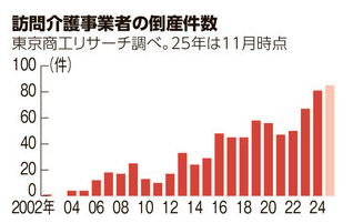 | 訪問介護事業者の倒産が過去最多に 3年連続 報酬引き下げが打撃 朝日新聞の記事です。 2025年の訪問介護事業者の倒産件数が、11月時点で過去最多を更新したことが東京商工リサーチ(TSR)の調査でわかった。 人手不足や、介護報酬(介護サービスの公定価格)の改定を背景に、合理化が難しい中・小規模の訪問介護事業者を中心に、経営環境が厳しさを増しているとみられる。(以下、省略) 訪問介護は必要な事業です。 しかし倒産が増加しているといいます。 |
