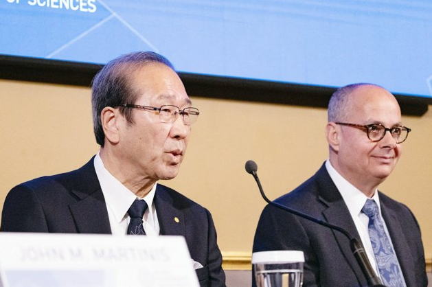 ![]() ノーベル化学賞に選ばれ、記者会見する北川進さん(左)と、共同受賞者のオマー・ヤギーさん =2025年12月7日、ストックホルム、有元愛美子撮影 |