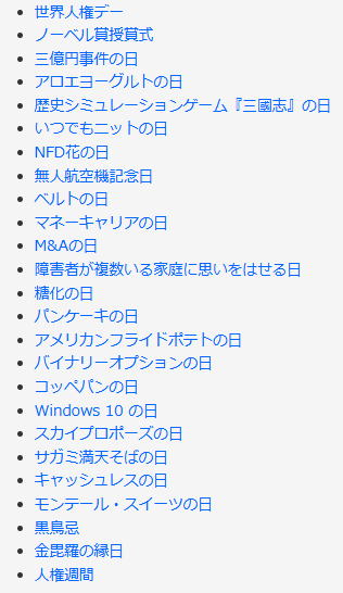 今日は何の日 (出典 雑学ネタ帳)![]() 世界人権デー(12月10日 記念日) 1950年(昭和25年)の第5回国連総会で制定。国際デーの一つ。英語表記は「Human Rights Day」。 ![]() Human Rights Day 1948年(昭和23年)のこの日、フランス・パリで行われた第3回国連総会で「世界人権宣言」(Universal Declaration of Human Rights:UDHR)が採択された。 世界人権宣言は、すべての人民とすべての国が達成すべき基本的人権についての宣言である。また、後に国連で結ばれた「人権条約」の基礎となっており、世界の人権に関する規律の中でもっとも基本的な意義を有する。この宣言は、「すべての人間は、生まれながらにして自由であり、かつ、尊厳と権利とについて平等である」で始まる全30条と前文からなる。 この日は「人権デー」や「世界人権の日」などとも呼ばれる。日本ではこの日を含む12月4日〜10日の一週間を「人権週間」、前一ヵ月の11月11日〜12月10日を「人権尊重推進強調月間」としている。 ![]() 人権週間 「人権週間」は、法務省と全国人権擁護委員連合会が、世界人権宣言が採択されたことを記念して、1949年(昭和24年)に制定した。同宣言の意義を広く国民に訴えるとともに、人権尊重思想の更なる普及高揚を図ることを目的としている。この期間には、全国各地においてシンポジウムや講演会、座談会、映画会などのイベントが開催される。 |