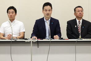 ![]() 衆院自民党会派入りで調整が進む(左から)守島正衆院議員、斉木武志衆院議員、阿部弘樹衆院議員 =2025年9月8日午後2時3分、国会内、岩下毅撮影 |