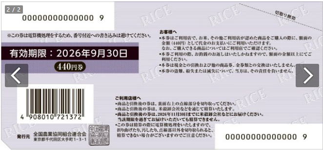 ![]() 政府の総合経済対策向けにJA全農が新たに発行する「おこめギフト券」の裏面のイメージ=JA全農提供 |