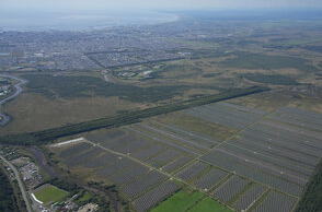 ![]() 釧路湿原道路沿いにあるメガソーラー。 奥は釧路市の市街地=2024年9月18日、北海道釧路町、朝日新聞社機から |