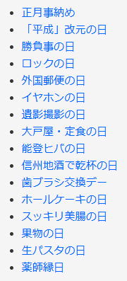 今日は何の日 (出典 雑学ネタ帳)![]() 正月事納め(1月8日 年中行事) 正月の各種行事・飾りを終える日。 正月を迎える準備を始めるのは「正月事始め」で、かつては旧暦12月13日、現在は新暦12月13日に行われる。「煤(すす)払い」や、門松などに用いる松を山から切ってくる「松迎え」などの正月の準備にとりかかる日である。 これに対して、「正月事納め」は「松の内」または「注連(しめ)の内」の期間に飾られた門松や注連縄(しめなわ)の飾りを取り外す日である。 「松の内」「注連の内」はかつては1月1日の「元日」から1月15日までとされていたが、現在は1月7日までとするところが多い。また、関東では1月7日、関西では1月15日までとする地域が多い。 |