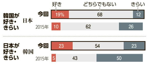 | 韓国で日本を「好き」な人が増えた訳 日韓共同世論調査、識者に聞く 朝日新聞の記事です。 日本と韓国の国交正常化から6月22日で60年となる。 朝日新聞社と韓国の東亜日報社は、正常化から50年となった2015年に続き、両国で共同の世論調査を実施した。調査から見えた日韓関係や今後の見通しについて、韓国・峨山政策研究院の崔恩美(チェウンミ)研究委員(日韓関係)に聞いた。(以下、省略) 変化を引っ張っているのは20代、30代の若い世代だ。 特に20代以下の男性の日本に対する好感度が高い。 この世代は、日本の大衆文化が1998年から段階的に開放された後に子ども時代を過ごし、日本のアニメや漫画、ゲームなどに自然な形で触れてきた。 |