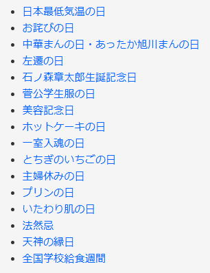 今日は何の日 (出典 雑学ネタ帳)![]() 日本最低気温の日(1月25日 記念日) 1902年(明治35年)のこの日、北海道上川地方旭川市で日本の気象観測史上の最低気温であるマイナス41.0℃を記録した。これが日本の最低気温である。 ![]() 寒い冬の日 1978年(昭和53年)2月17日に北海道の幌加内町母子里(ほろかないちょうもしり)の北大演習林でマイナス41.2℃を記録したが、気象庁の公式記録の対象から外れていたため、公式では上記の旭川市の記録が最低気温となっている。2月17日は記念日として「天使の囁きの日」となっている。 また、富士山頂の最低気温としては、1981年(昭和56年)2月27日にマイナス38.0℃を記録している。年間平均気温(1981〜2010年)は富士山頂がマイナス6.2℃、旭川市が6.9℃で、富士山頂のほうが13.1℃も低い。年間平均気温で見ると富士山頂が日本で最も寒い場所と言える。 ちなみに、世界の最低気温の記録は1983年(昭和58年)7月21日に南極大陸のロシア・ヴォストーク基地で観測されたマイナス89.2℃であった。その後、記録が更新され、2010年(平成22年)8月10日に南極大陸の東部のドームA付近でマイナス93.2℃を観測し、これが世界の最低気温となっている。 関連する記念日として、2025年(令和7年)11月時点で「日本最高気温の日」は8月5日(群馬県伊勢崎市・2025年)となっている。その最高気温は41.8℃である。 |