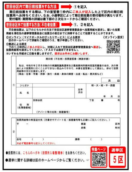![]() 東京都世田谷区が今回の衆院選で発送する予定の投票所入場整理券(5区用の裏面)のサンプル=世田谷区提供 |