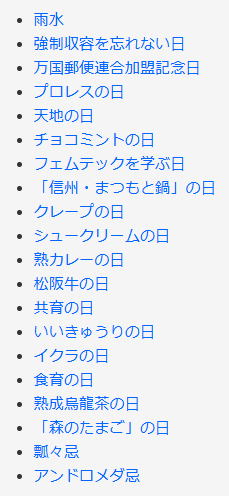 今日は何の日 (出典 雑学ネタ帳)![]() 雨水(2月19日頃 二十四節気) 「雨水(うすい)」は、「二十四節気」の一つで第2番目にあたる。現在広まっている定気法では太陽黄経が330度のときで2月19日頃。 「雨水」の日付は、近年では2月18日または2月19日であり、年によって異なる。2026年(令和8年)は2月19日(木)である。 「雨水」の一つ前の節気は「立春」(2月4日頃)で、一つ後の節気は「啓蟄」(3月6日頃)である。「雨水」には期間としての意味もあり、この日から、次の節気の「啓蟄」前日までである。西洋占星術では「雨水」が双魚宮(そうぎょきゅう:うお座)の始まりとなる。 雪や氷が解けて水となり、雪に代わって雨が降り始める頃という意味で「雨水」とされる。実際は積雪のピークであるが、この時節から寒さが峠を越え、暖かくなり始めると見ることもできる。 植物の草や木も芽を出し始め、日ごとに春を感じさせる。また、春一番が吹き、鶯(ウグイス)の鳴き声が聞こえ始める地域もある。 ![]() 梅とウグイス 江戸時代の暦の解説書『こよみ便覧(べんらん)』には「陽気地上に発し、雪氷とけて雨水となれば也」と記されている。江戸時代の商家では「雨水」からひな人形を飾ると良縁に恵まれると言われ、農家では昔から「雨水」を農耕の準備を始める目安としてきた。 |