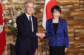 ![]() 首脳会談前、カナダのカーニー首相(左)と握手を交わす高市早苗首相 =2026年3月6日午後7時12分、首相官邸、岩下毅撮影 |