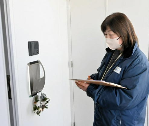 ![]() 鹿折南住宅で入居者の見守りをするLSAの及川浩江さん =2026年2月10日午後0時11分、宮城県気仙沼市 |