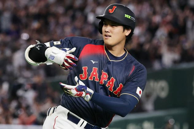 ![]() 二回表日本1死満塁、大谷翔平は満塁本塁打を放ちベンチに向かってポーズを決める=友永翔大撮影 |