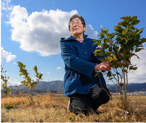 ![]() 自宅跡地に植樹したツバキに寄り添う三浦祝子さん。 視線の先には防潮堤越しの海が広がる =8日午後2時13分、宮城県気仙沼市、角野貴之撮影 |