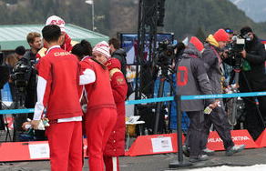 ![]() 距離女子スプリント・クラシカル視覚障害の表彰式で、ロシアや中国選手との「自撮り撮影」に 参加せず退場するドイツの選手ら(右)=吉田耕一郎撮影 |