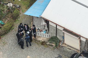 ![]() 亡くなった安達結希さんの自宅を調べる捜査員ら =2026年4月15日午前10時3分、京都府南丹市、朝日放送テレビヘリから、田辺拓也撮影 |