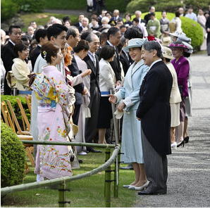 ![]() 春の園遊会で、ミラノ・コルティナ冬季五輪フィギュアスケートペアの三浦璃来さん、 木原龍一さんと言葉を交わす天皇、皇后両陛下 =2026年4月17日午後、東京・元赤坂、代表撮影 |