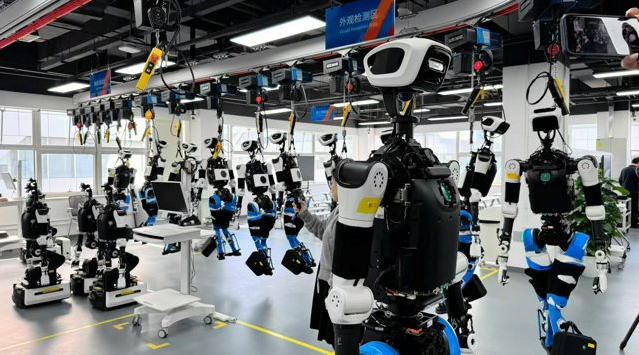 ![]() 人型ロボット「天工」の製造ラインでは出来上がったロボットがつるされる形で並んでいた =2026年3月20日、北京市、鈴木友里子撮影 |