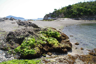 | ハナグリ岩の上からの眺め:潮が満ちると浜が水没してハナグリ岩に渡れなくなる。 | ![]() |