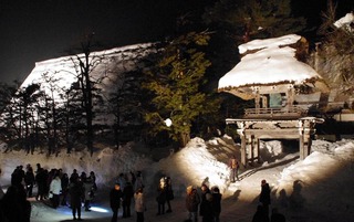 | ライトアップされた白川郷の合掌づくり。明善寺の鐘楼門(県重文)と庫裏。 | ![]() |