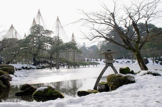 | 雪吊りの金沢兼六園。徽軫(ことじ)灯籠と霞ケ池。 | ![]() |