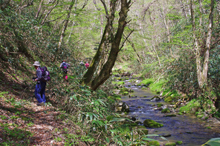 | ようやく芽吹き始めた広葉樹林帯:林床にはスミレ、ニリンソウなど多くの花が咲いていた。 | ![]() |