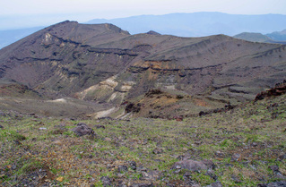 | 高岳山頂からの眺め:仙酔峡ロープウェー駅から中岳火口展望台へのルートが一望(ロープウェー運休中)。 | ![]() |