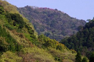 | 大谷ダムから茶臼山の眺め:山頂がミツバツツジでピンク色 | |