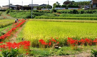 私は郷土出身ですが、知りませんでした。 ご主人のコメント 菜園に行く途中、彼岸花が田圃の畦や民家の周辺で満開でした。 黄金色に実った稲穂と彼岸花の赤色が見事に映えていて、車を止めて写真を撮りたくなりました。 先日、墓参りの帰途に撮った彼岸花の写真を送ったばかりですが、また写真を送ります |
