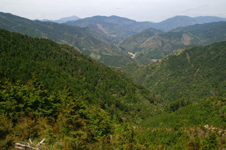 | 日暮ケ岳近くの尾根から遡上して登って来た四氏谷川方面(右側下方向)を見下ろす:後方に西中国山地の西端の山並み | ![]() |
