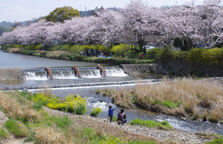 切戸川は、下松市街の中央を流れる川で、川の両岸に沿って約200本のソメイヨシノの並木が続いています。