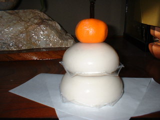 | 本日は、「鏡開き」です。 写真は、我が家の飾りもちです。 ご覧のように、ビニールシートにくるんだまま飾ってありますので、あまり固くなりません。 |