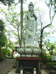 | 聖観世音菩薩 門を入ってすぐ左手に10メートルもあろうかという巨大な石仏像が見えます。 当寺からさほど遠くない場所にあったホテルニュージャパンで火災が発生し、多数の人命が失われたのを悼んで建立された「聖観世音菩薩」です。 この近くに、「聖鋏観音像」というお像もあります。美容家の山野愛子さんの提唱で、ハサミを供養するために建立したものです。 毎年8月3日の「鋏の日」には、この観音像の前で鋏供養が行われるそうです。 |