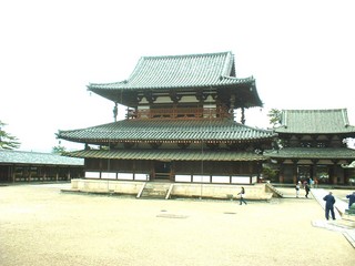| 大講堂 仏教の学問を研鑽したり、法要を行う施設として建立されました。 大講堂の両脇には、経蔵と鐘楼があります。これは古代寺院の様式で、大講堂に並んで経蔵・鐘楼が並存するのは法隆寺だけだそうです。 また垂木勾配を緩くしたままにする為日本独特の屋根の上に屋根を設けるという形式の屋根では現存最古ものです。 |