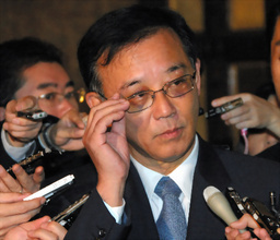 ![]() 自転車事故から復帰し、国会内で記者の 質問に答える自民党の谷垣禎一総裁 |
