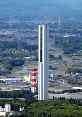 ![]() 世界一高いエレベーター研究塔。 左隣の塔が従来の塔= 15日午後、茨城県ひたちなか市 (朝日新聞より) |