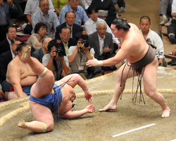 ![]() 白鵬ははたき込みで琴奨菊を下し、 53連勝を達成(アサヒコムより) |