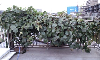 | キウイ 写真は我が家の屋上で採れたキウイです。 大き目のものを写真に撮りましたが、合わせて50個ばかり採れました。 屋上のキウイの木の様子です。 地上から屋上まで這い上がってきました。 キウイの生命力には驚かされます。 来年は、屋上に棚を作ろうかと考えております。 |