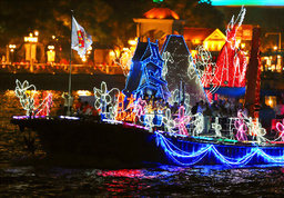 | 富士山や城をイメージしたネオンで飾られ、開会式会場に向けて珠江をパレードする日本選手団の船 | ![]() |