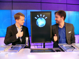 ![]() クイズ番組で米IBMの人工知能「ワトソン」(中央)と対戦することになった 王者ケン・ジェニングズさん(左)、 ブラッド・ラターさん |