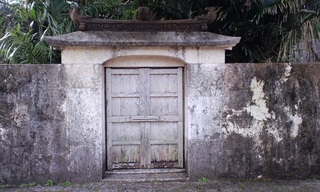 | 首里城見学 首里森御嶽 由来によると、かつて首里城には「十嶽」といわれる十のいべ(御嶽の内部の最も神聖な場所)がありました。その中の10番目のいべ、「きやうの内の前の御庭首里のいべ」が、首里森御嶽です。その歴史は古歌謡集「おもろさうし」にもよく詠まれているほど古く、男の空間である下之御庭にあって、ここばかりは男女がともに祈願する国の最も重要な拝所でした。京の内の一部であるという考え方もあります。 現在の首里森御嶽は、遺構石積や配置図、絵図などから往年の形状・規模等を究明して、1997年に復元されました、とあります。 当日のガイドさんの説明によると、この扉の向こうは来世の世界であり扉を開けることは禁じられているとのことでした。 |