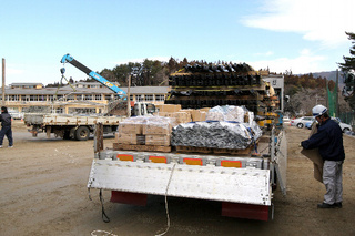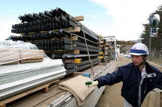 | 仮設住宅建設のため、運び込まれた建材=19日午前8時39分、岩手県陸前高田市 | |
