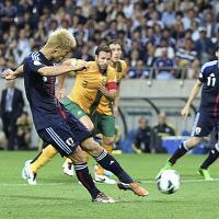 | 後半終了間際、本田が同点のPKを決める(4日、埼玉スタジアムで)=里見研撮影 | ![]() |