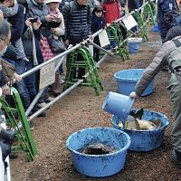 ![]() かいぼりで揚がった魚を 見に、多くの人が集まった (都立井の頭恩賜公園で) |