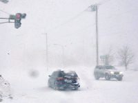 ![]() 吹雪の中、低速で進む車(3月21日午後2時49分、北海道根室市で)=土居宏之撮影 |