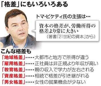 | 格差問題、どう考えたらいいの? 貧困層は徐々に増加 朝日新聞の記事です。 円安で大企業がもうかり、株高でお金持ちが潤う一方、生活に苦しむ貧困層が増えている――。 そんな所得や資産をめぐる「格差」が論争になっています。 格差には、正社員と非正規の処遇の違いや、大都市と過疎化が進む地方といった問題もあります。 「格差はやむを得ない」と考える人も少なくありません。 この問題をどう考えたらいいのでしょうか。(以下、省略) 岡田克也・民主党代表の「格差が拡大している事実を認めるか」という質問に対して、 「格差に関する指標は様々であり、格差が拡大しているかどうかは、一概に申し上げられない」と安倍首相は答えております。 格差は昔からあったと思いますが、これからますます格差が広がっていくのではないでしょうか。 例えば、株価が急上昇しております。 株を持っている人は大儲けとなりますが、株を持っていない人は全く関係ありません。 要は、金持ちから税金をがっぽりと取ることではないでしょうか。 |