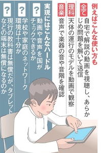 | 小中高の教科書、デジタル化検討へ 16年度中に結論 朝日新聞の記事です。 文部科学省は、小中高校で使う教科書をデジタル化する方向で本格的な検討に入る。 政府の教育再生実行会議が22日にまとめる提言案にもデジタル化の推進が盛り込まれる見込み。 これを受け、来月にも有識者会議を立ち上げて、2016年度中に結論を出したい考え。 文字や図だけだった教科書が、音声や動画などにも広がる可能性がある。(以下、省略) 教科書がタブレットになるとは驚きです。 副教材としてタブレットを使用するのは良いとしても、教科書はやはり紙であるべきではないでしょうか。 |